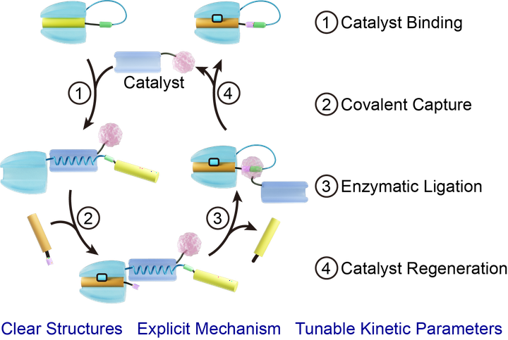 Image credit: ACSA biological system is rich in dynamic biomolecular assemblyreaction cascades mediated by enzymes and molecular chaperones, as represented by the formation of the “chain-mail-like” bacteriophage HK97 capsid that involves sequential events of chaperone-assisted assembly and cross-linking reactions. To shed light on such catalyzed assembly processes, we report an artificial protein−peptide “assembly-reaction” cascade that can be accelerated by rationally designed catalysts. The cascade is inhibited by a tethered SpyTag mutant that blocks SpyCatcher from the subsequent reactions. A designed fusion of calmodulin and sortase can promote the cascade by first binding with M13 at the loop between the SpyTag mutant and SpyCatcher to open the gating via a coil−helix transition. After the SpyTag-SpyCatcher reaction, the catalyst is regenerated by sortase-mediated cyclization that restores the constrained M13 conformation at the loop to release the bounded calmodulin. In the presence of 0.1 equiv of catalyst, the process can be accelerated, increasing the initial rate by ∼12-fold and reducing the half-life by ∼17-fold. With experimentally measured kinetic parameters, we simulated this system through microkinetic modeling, illustrated the contributions of each parameter, and proposed conditions for optimal catalytic performance. As a prototype of artificial catalyzed supramolecular “assembly-reaction” cascades, this work is reminiscent of those catalyzed cascades in nature. Their common features reveal similar underlying physiochemical principles and suggest new avenues to understand and interfere with biological systems.