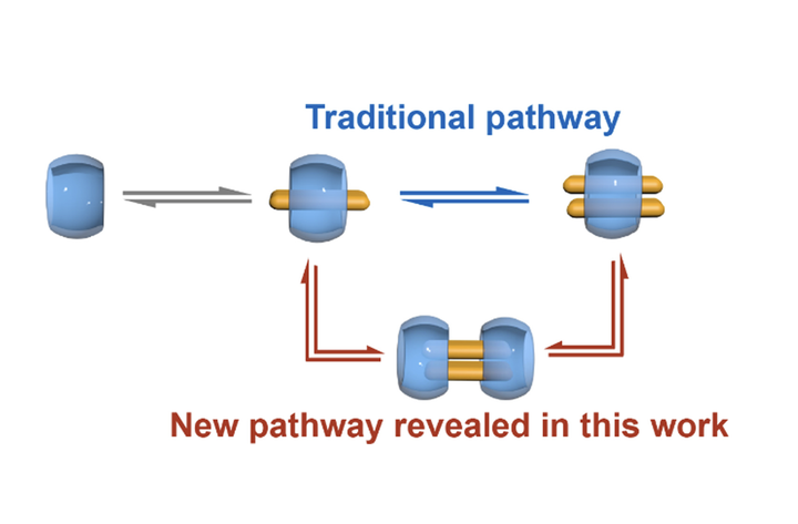 Image credit: CCSMolecular assembly is typically viewed as a stepwise process from lower- to higher-order structures. Here, we uncovered an alternative kinetic pathway in the cucurbit[8]uril (CB[8])-mediated assembly, where a transient quaternary (2:2) complex formed before the thermodynamically favored ternary (2:1) product. Stopped-flow spectroscopy and structural analysis confirmed the 2:2 intermediate, which formed 36-fold faster than the direct 1:1 → 2:1 pathway at 298 K. The system thus accumulated in the 2:2 state before relaxing to the 2:1 product. These findings revise the conventional binary-to-ternary model and highlight the mechanistic relevance of higher-order intermediates. It also refines our understanding of apparent cooperativity within a complex assembly network. Recognizing such kinetic complexity opens new avenues for dynamic control in the design of high-performance functional and structural materials.
