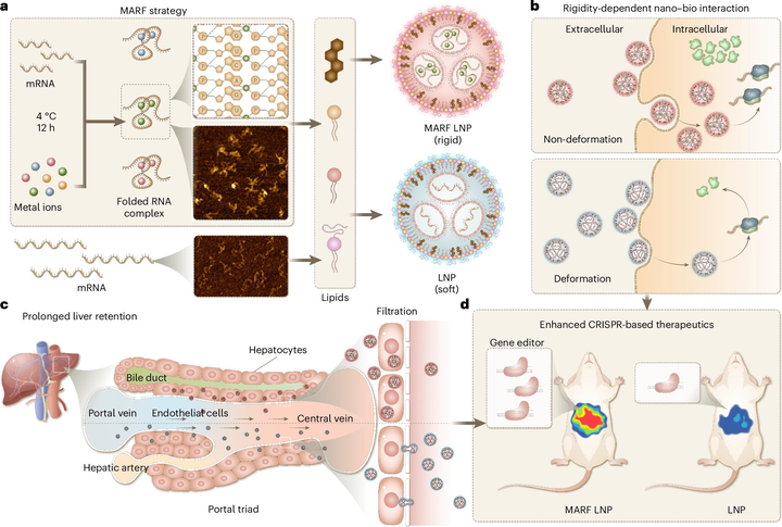 The application of messenger RNA (mRNA) beyond infectious diseases is challenged by inefficient protein production. Whereas the engineering of secondary mRNA structures has been shown to increase mRNA half-life, it remains unclear whether tertiary mRNA structures influence therapeutic efficacy. Here we develop a metal-ion-assisted RNA folding (MARF) strategy and show that, when delivered with lipid nanoparticles (LNPs), specific metals promote mRNA folding architectures that result in the amplification of protein expression by up to 7.3-fold compared with control mRNA. This effect is due to altered mechanical interactions between the mRNA LNPs and the surrounding biosystem, resulting in enhanced intracellular processing and prolonged retention of delivered mRNA in targeted cells. Administered intravenously, MARF LNPs achieved effective and durable genome editing of the clinically relevant Pcsk9 gene through treatment with a single dose. Overall, this work provides a new MARF technology for more effective mRNA therapy and highlights the potential of mechanical cues in designing nanoparticles for improved mRNA delivery. A metal-ion-assisted RNA folding technique is used to modulate the mechanical interactions between RNA nanoparticles and cell membranes for improved protein expression and mRNA therapy.