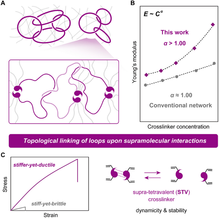 Polymer networks possess numerous elastically defective and isolated loops, which do not contribute to mechanical stiffness. In this report, we introduce a strategy of supramolecular topological linking to access stiffer‐yet‐ductile polymeric materials through incorporation of supramolecular tetravalent crosslinkers. Dynamic dissociation/re‐association between these high‐functionality crosslinks enables the formation of topologically‐linked loops that serve as elastic springs to stiffen the networks. An exceptional scaling exponent of 2.05 for Young’s modulus versus crosslinker concentration is obtained, exceeding most reported randomly‐crosslinked polymeric systems. Compared to conventional analogs, the mechanical properties of the resultant materials are enhanced: Young’s modulus (2‐fold), elongation at break (8‐fold), and work of fracture (100‐fold). Uplifting modulus scalings through supramolecular topological linking paves a new path to the design of stiffness‐reinforced soft materials, holding substantial promise in load‐bearing application scenarios such as tissue implants, bioelectronic interfaces, and soft robotics.
